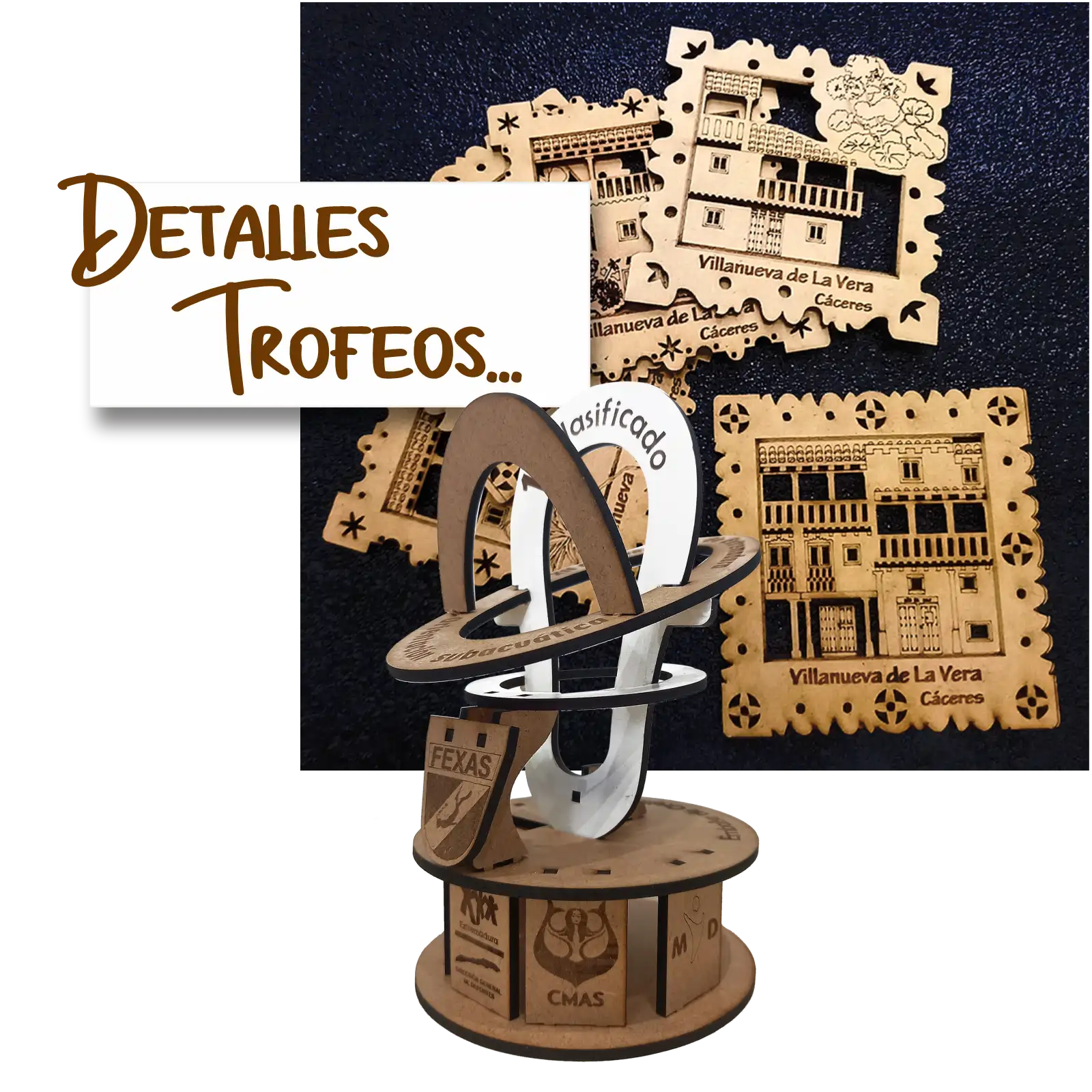 Trofeos. Logotipos. Emblemas. Cualquier objeto que pueda ser de su necesidad. En miniatura de madera. Montado y embalado para su entrega final.